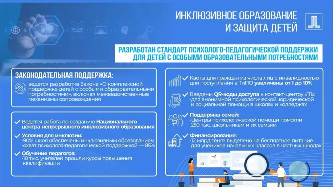 Инклюзия в школах: 90% школ Казахстана создали условия для обучения детей с особыми образовательными потребностями. В Казахстане впервые разработан стандарт специальной психолого-педагогической поддержки детей с особыми образовательными потребностями на всех уровнях образования. Разрабатывается закон "О комплексной поддержке детей с особыми образовательными потребностями", который будет включать межведомственные механизмы сопровождения семьи и ребёнка. Ведётся работа по созданию Национального центра непрерывного инклюзивного образования. В 90% школах страны созданы условия для получения инклюзивного образования, а охват детей специальной психолого-педагогической поддержкой достиг 85%. Сеть специальных организаций образования достигла 504 единиц. Открыт 121 кабинет поддержки детей с особыми образовательными потребностями при школах.